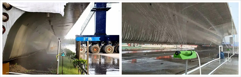 预制梁场全自动喷淋养护系统由智能供水系统喷洒养护过程中的每个环节控制全部实现智能化,可实现预制箱梁的自动喷淋雾化养护,有效的提高了预制箱梁混凝土强度,防止了裂缝。